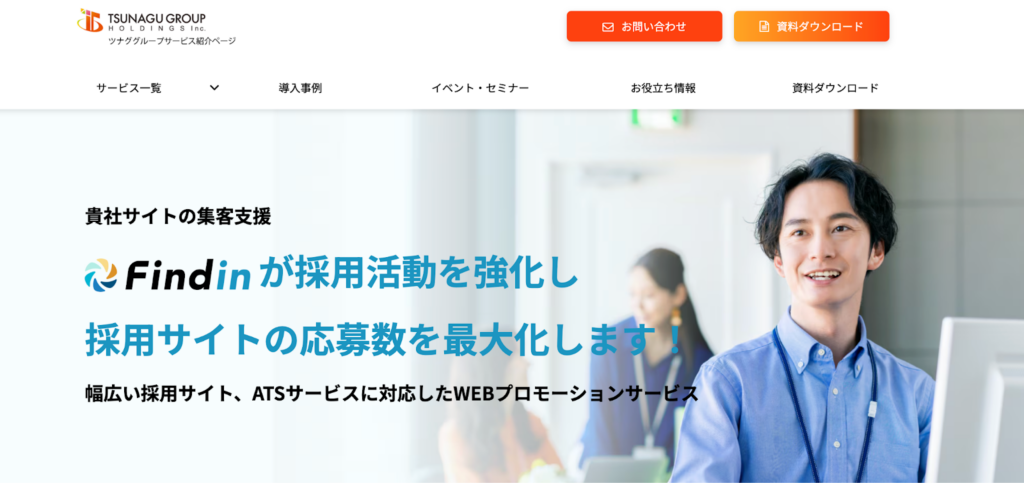 Findin(ファインドイン)は、株式会社ツナググループホールディングスが提供する採用管理システム(ATS)です。求人メディア運営のノウハウをもとにした、採用活動を効率的にする機能が搭載されています。求人広告の出稿から応募者管理、Web面接などをシステム上でワンストップで行うことが可能です。