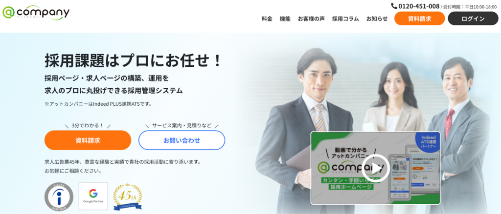 アットカンパニーは、採用ホームページの作成や求人掲載、応募者情報の管理からWEB面接機能まで、採用活動に必要な幅広い機能が充実している採用管理システム(ATS)です。Indeed認定パートナーである大新社が展開していることから、Indeedからの応募獲得に強く、Indeed PLUSとも連携できるため、効果的に母集団形成できます。また、Indeed PLUSの連携ATSであり、求人ボックスの正規販売代理店でもあるため、必要に応じてオプションを利用しながら求人の露出UPを図ることができるのも心強いポイントです。