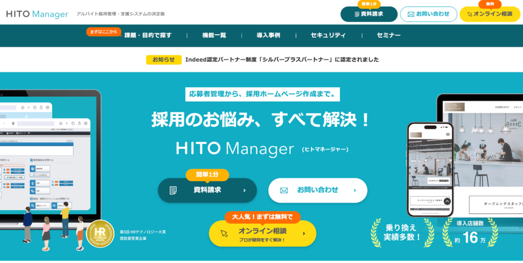 HITO Manager(ヒトマネージャー)は、パート・アルバイトの採用管理・支援に特化してる採用管理システム(ATS)です。Indeed、LINE、SMSとのスムーズな連携が可能で、応募者とのやりとりがしやすいことも特徴です。とくに若年層の取り込みに強みがあるサービスとなっています。自動返信メールや面接管理、採用計画作成といった管理も行いやすいため、スーパーや飲食店でも導入されている採用管理システム(ATS)です。