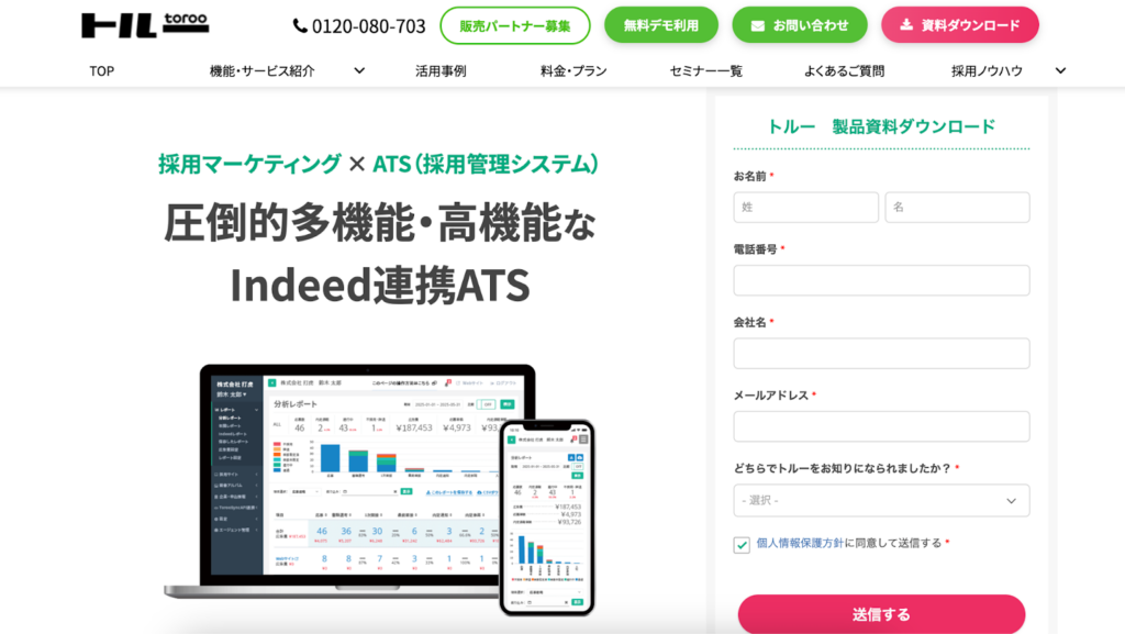 トルーは、採用サイトが簡単に作れるなど、操作性にも定評がある採用管理システム(ATS)です。応募経路別分析やステータス管理も行いやすく、分析から修正までをスムーズに行えます。SNSなどの発信にも使いやすい採用向けのランディングページを自動生成できるほか、Indeedにも連携しているため、スピーディーで効果的な求人公開が可能です。